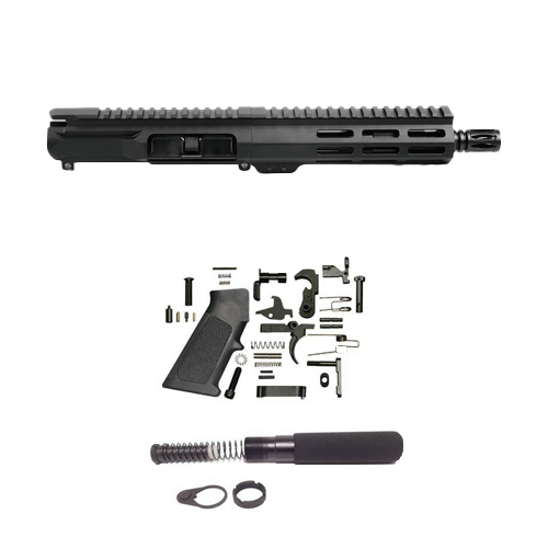 The 7.5″ Slick Side Billet AR-15 Pistol Kit offers AR enthusiasts an affordable yet high-quality upper assembly. This kit features a 7.5-inch nitride-treated barrel chambered in 5.56 NATO, ensuring durability and precision. It uses a robust nitrided steel gas block from a reputable American manufacturer, paired with a quality American-made M-LOK free float handguard, which may vary in style depending on availability. Attention to detail is evident as each upper is assembled with Permatex 242 on critical components and mil-spec AEROSHELL 33MS Anti-Seize grease on the barrel nut and muzzle device, torqued to specification to guarantee reliability. The sleek, billet upper receiver is made from 6061 aluminum with M4 feed ramps and pairs seamlessly with any mil-spec lower. Completing the kit, an OEM Lower Parts Kit and Mil-Spec Pistol Buffer Tube Kit are included, making this set a standout choice for building a dependable AR-15 pistol that is guaranteed to function flawlessly right out of the box.