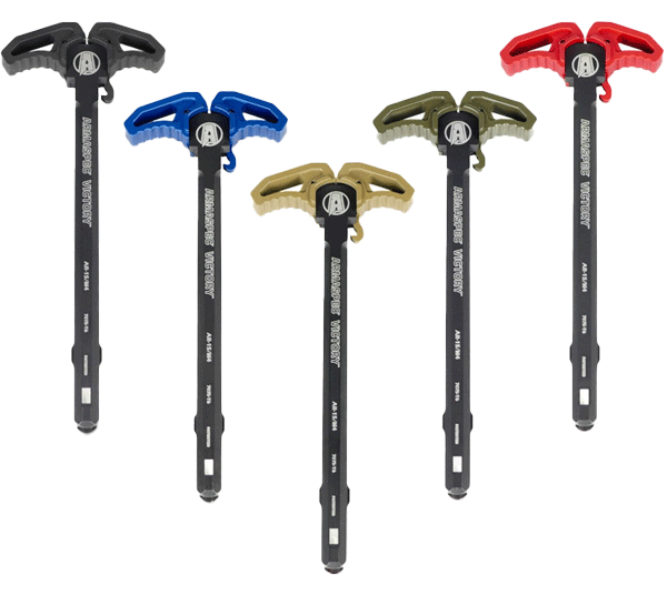 Introducing the Patent Pending Armaspec Victory Ambidextrous Charging Handle designed for AR-15 style rifles and pistols. This Ambidextrous charging handle’s latch design is one of the nicest I’ve seen or felt. The clever mechanism design provides a smooth, consistent, and balanced action on each side. This is also the company that manufactures the Stealth Recoil Spring 2-stage captured buffer system, so they have a good understanding of tuning for optimal spring rates. The “center fore charging,” as they call it, means that the design of the mechanism distributes a majority of the force toward the center of the handle to reduce shaft twisting.