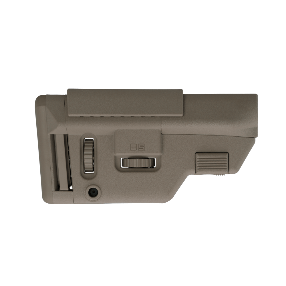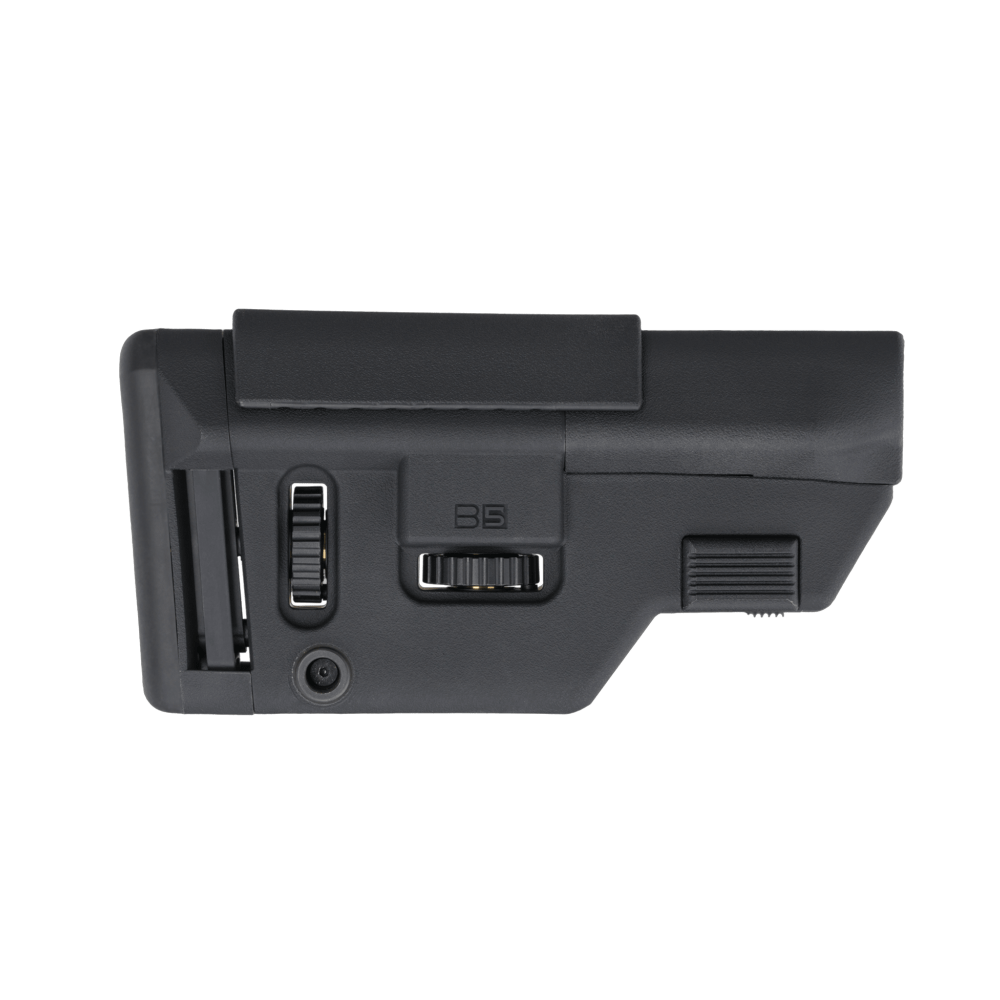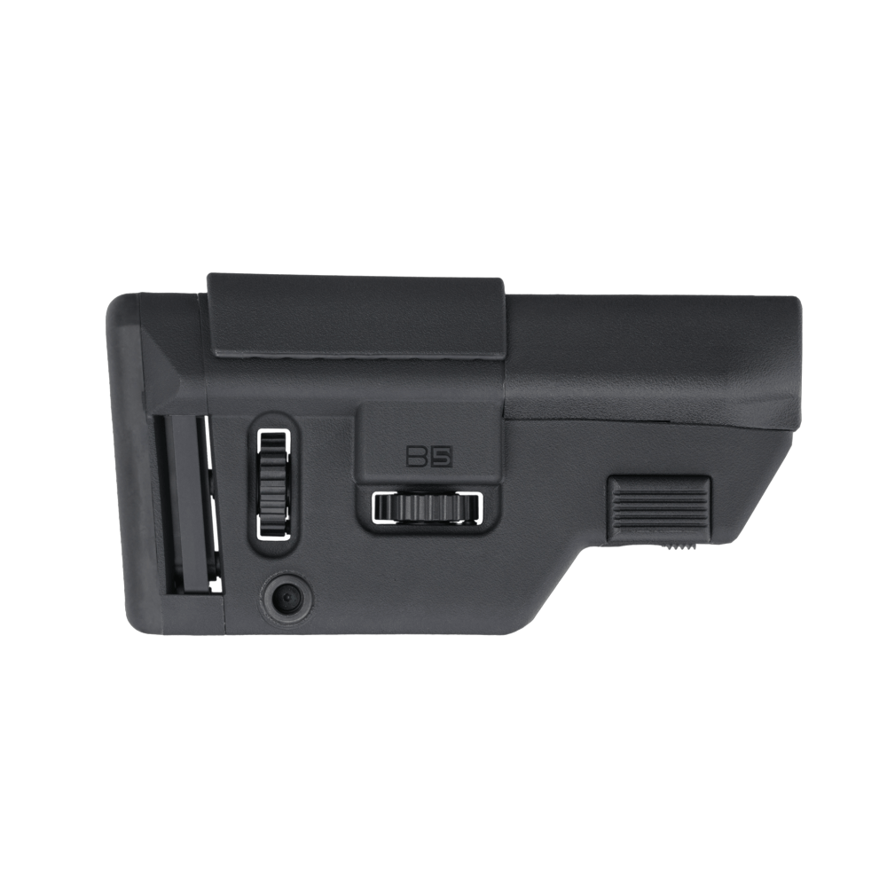 The B5 Systems Collapsible Precision Stock. Building upon the venerable cheek profile of the B5 Sopmod and Bravo stocks, the Precision stock incorporates an adjustable cheekpiece and buttpad while fitting Milspec carbine receiver extensions. Features internal tensioners, ambidextrous fixed and quick disconnect sling mounts, gross length of pull adjustment via pull down with lockout, underside M-LOK® accessory mount, and color-matched hardware. The CPS Short fully collapsed will clear the M110 charging handle. Proudly made in the USA.