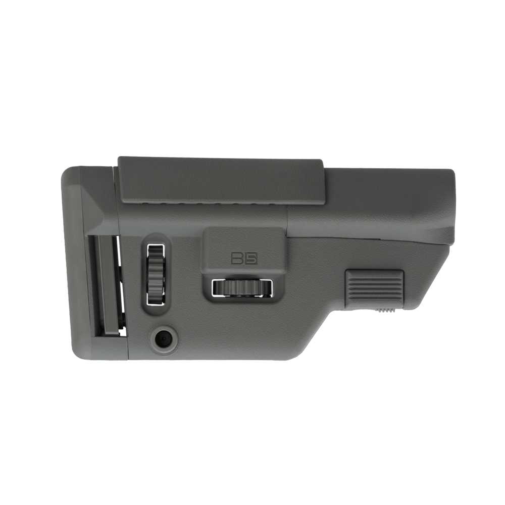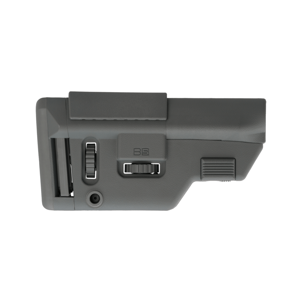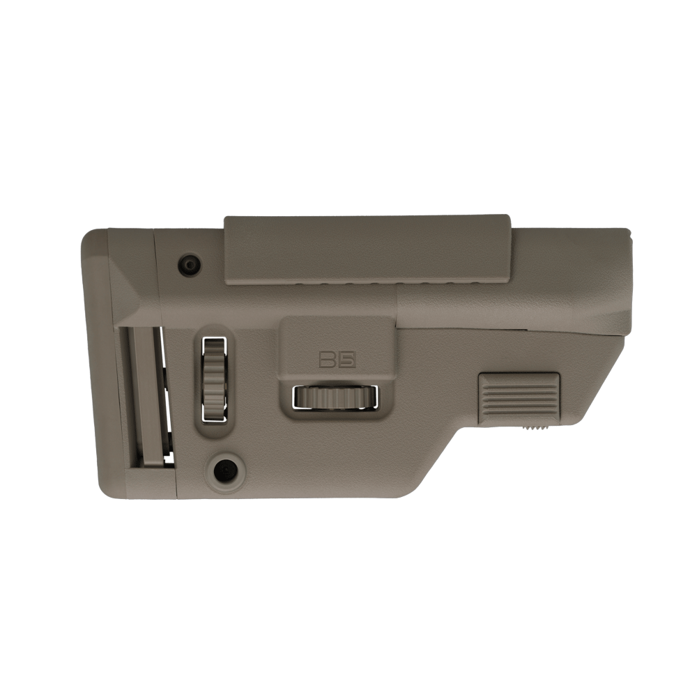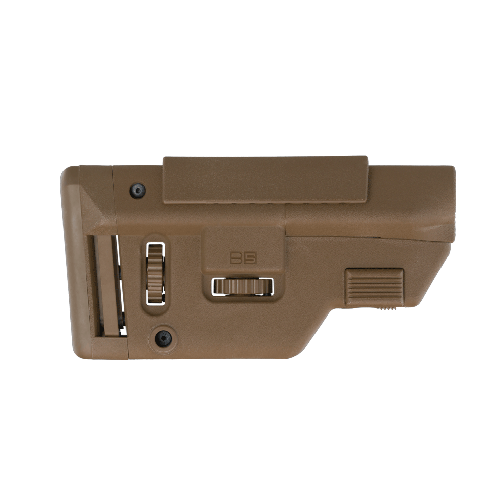 The B5 Systems Collapsible Precision Stock. Building upon the venerable cheek profile of the B5 Sopmod and Bravo stocks, the Precision stock incorporates an adjustable cheekpiece and buttpad while fitting Milspec carbine receiver extensions. Features internal tensioners, ambidextrous fixed and quick disconnect sling mounts, gross length of pull adjustment via pull down with lockout, underside M-LOK® accessory mount, and color-matched hardware. The CPS Short fully collapsed will clear the M110 charging handle. Proudly made in the USA.
