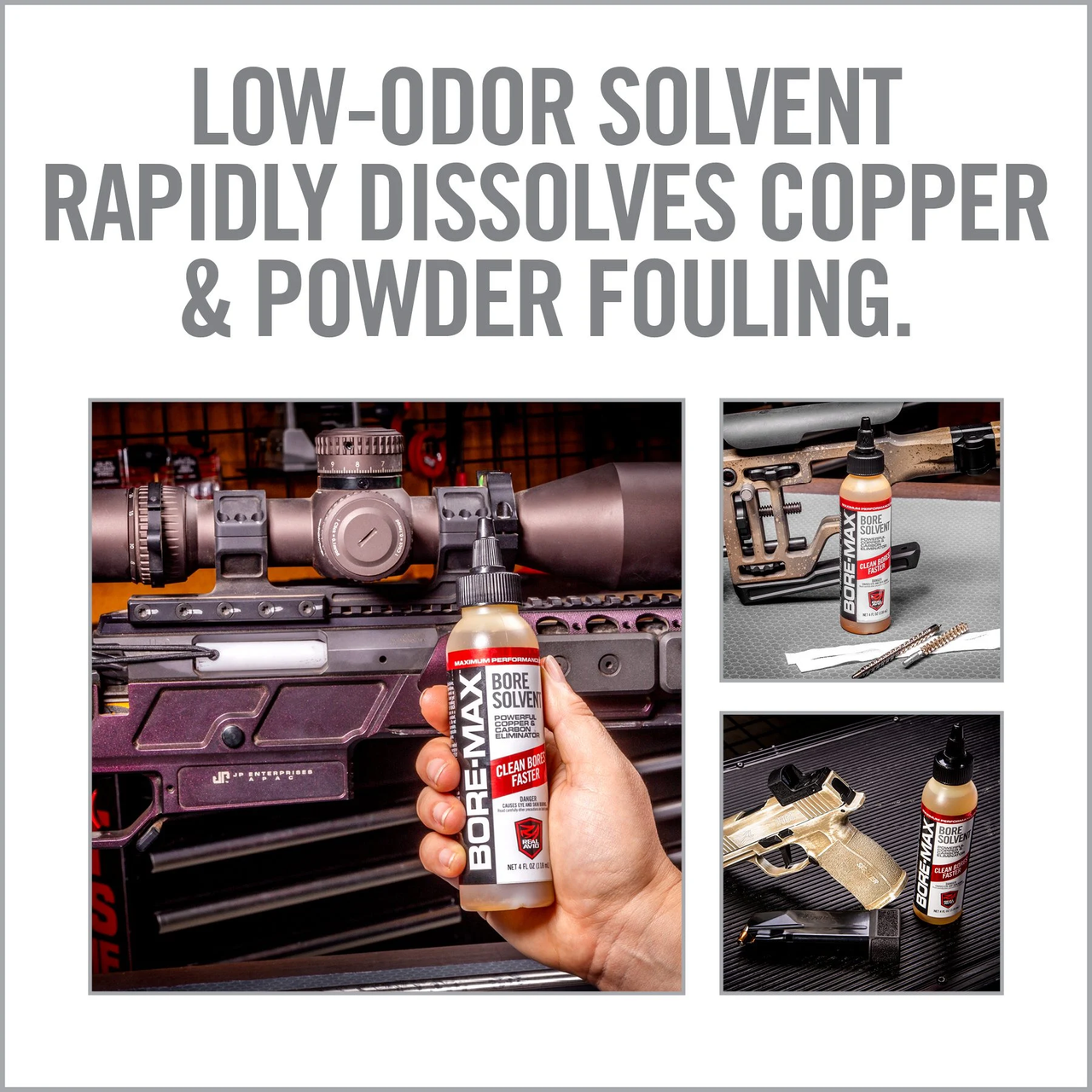 Powerful gun-metal grade solvent is specially formulated to penetrate within the gun bore, rapidly and effectively dissolving performance inhibiting copper and powder fouling.