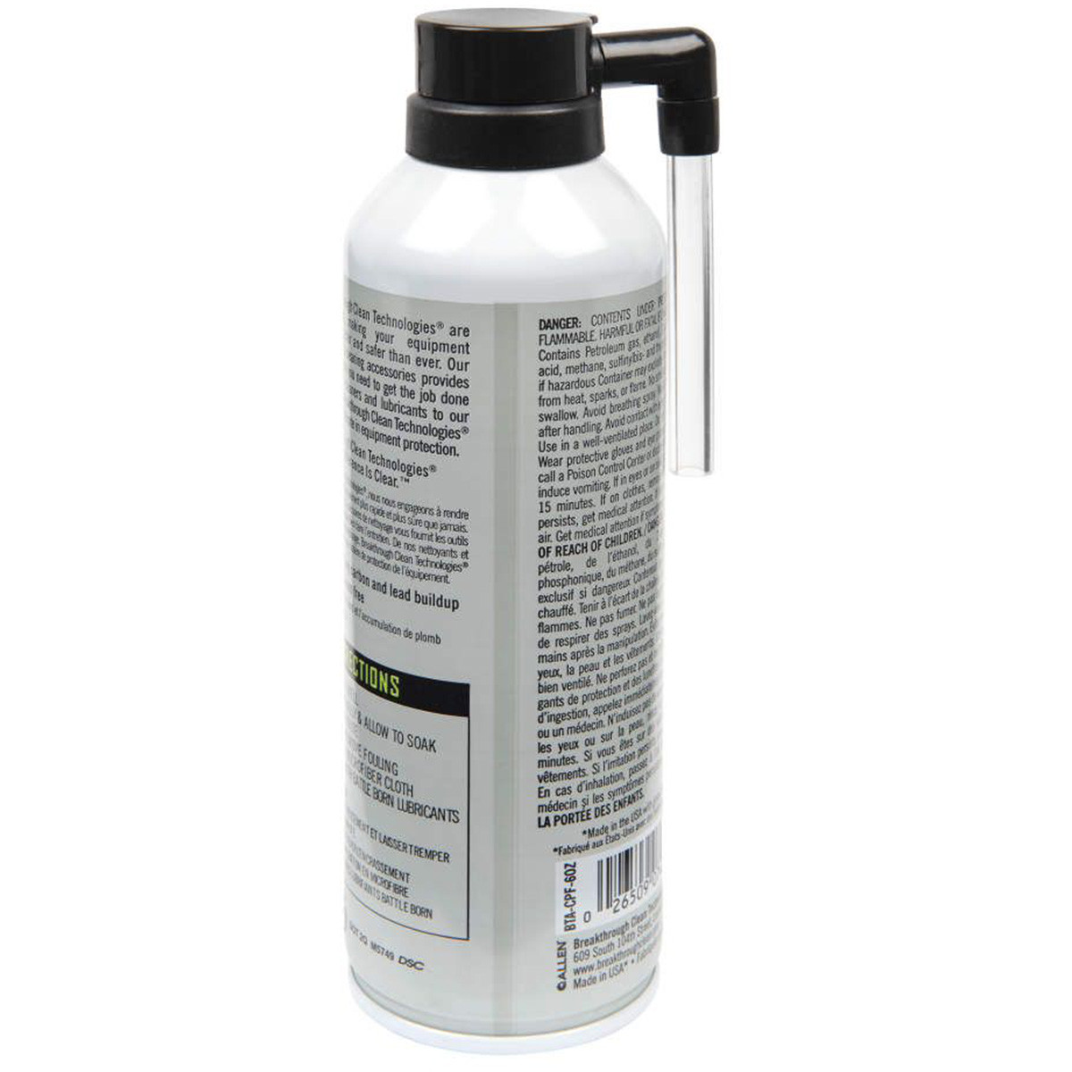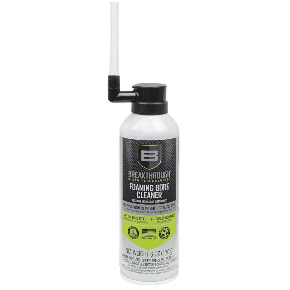 The Breakthrough Clean Technologies® Aerosol Foaming Bore Cleaner is part of our newest collection, the Aerosols Series, designed to give you more control over your cleaning. Aerosols are designed to be more user-friendly, enabling users to apply chemicals with greater accuracy. The Aerosol Foaming Bore Cleaner is engineered to be sprayed down the bore or barrel to remove baked-on carbon for better future use of your equipment. The solution is a water-based, ammonia-free cleaner that removes heavy carbon and lead deposits. Utilizing a proprietary blend of chemical surfactants and detergents, the Aerosol Foaming Bore Cleaner effectively neutralizes all corrosive residues, preventing damaging rust and corrosion without etching or harming the barrel’s steel surface. With no noxious fumes or hazardous chemicals, Aerosol Foaming Bore Cleaner is a safe and effective choice when it comes to removing stubborn carbon and lead build-up and cleaning the bore of your firearm. The Breakthrough Clean Technologies® Aerosol Foaming Bore Cleaner is odorless, safe to use, and made in the USA.