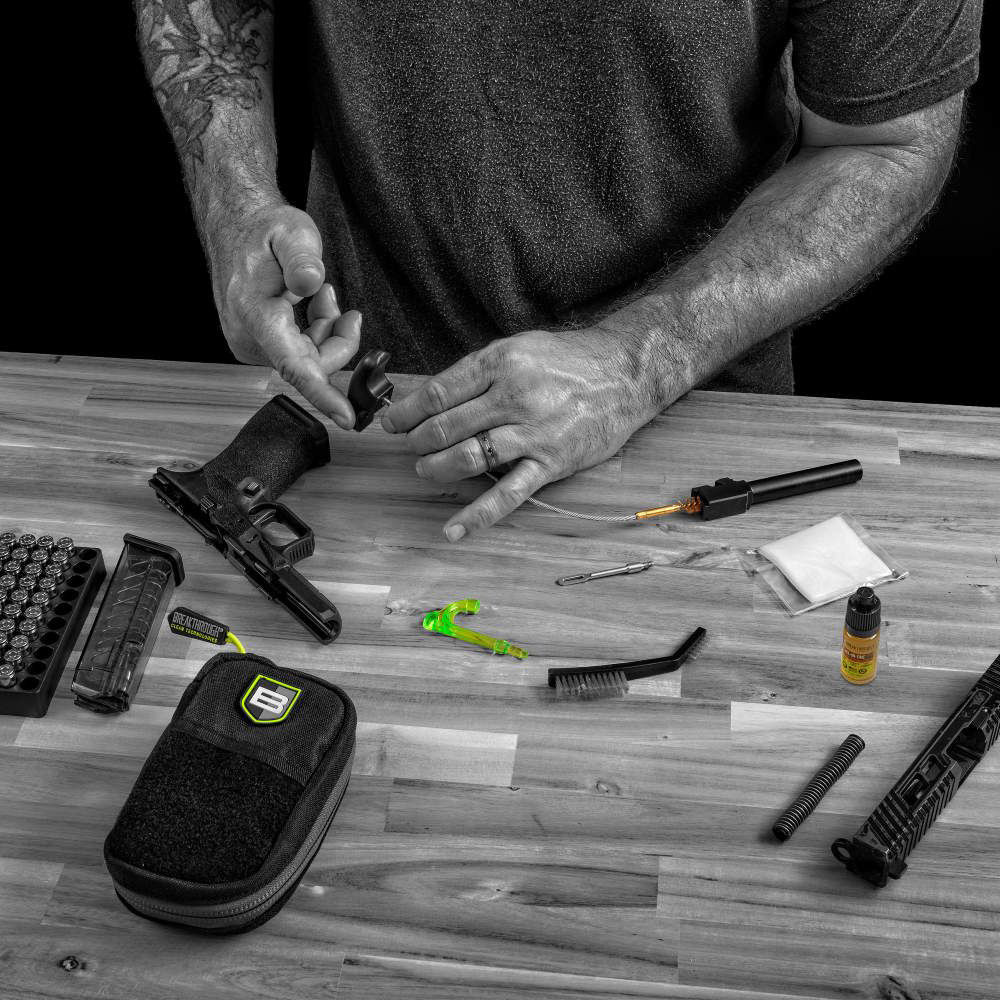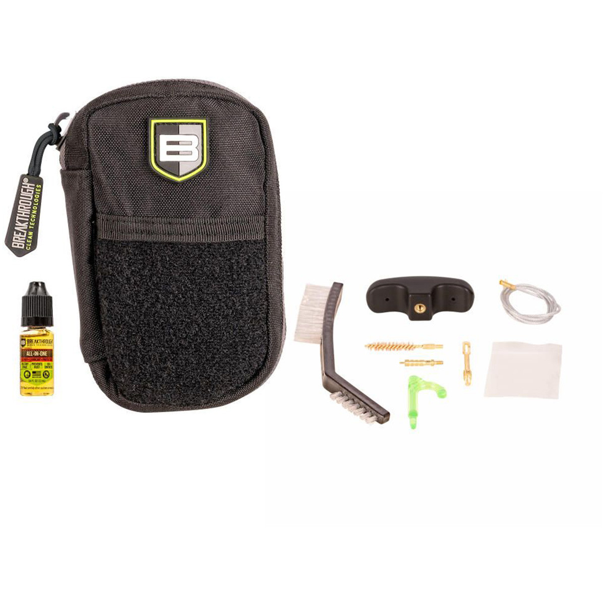 Experience the ultimate convenience with the Breakthrough Clean Technologies® Badge Series Pull-Through Cleaning Kit. This all-in-one kit packs a punch, ensuring your gun stays in top-notch condition. Featuring top-of-the-line cleaning tools and our highly effective All-In-One CLP, this kit has everything you need to clean your 9mm chambered firearms. All necessary accessories are provided and neatly organized in a rugged nylon molle pouch. Elevate your range day with a cleaner and more reliable firearm with Breakthrough Clean Technologies®.