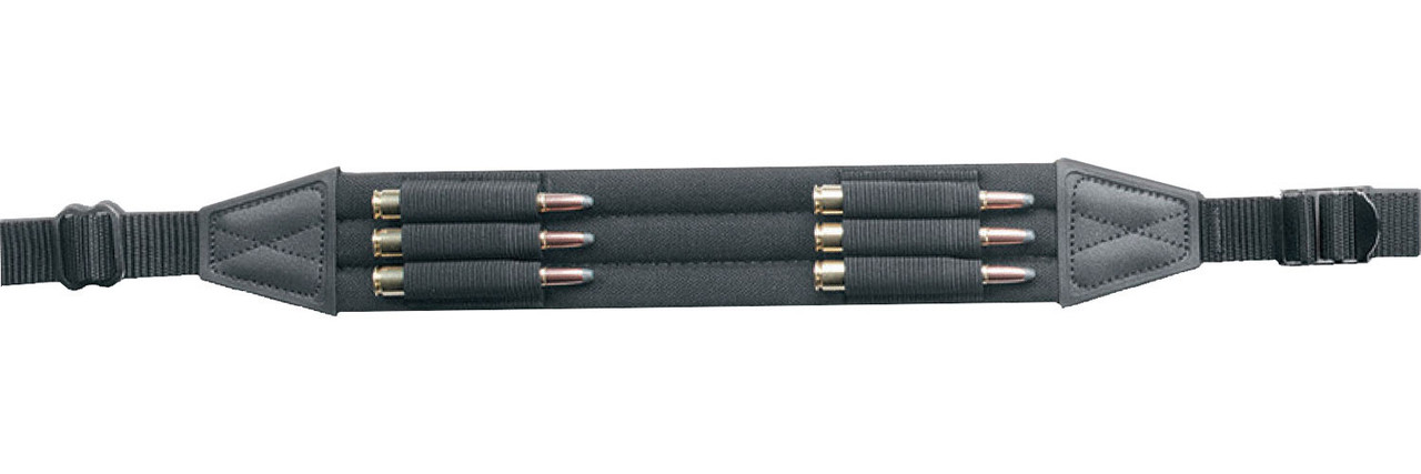 The Ultra Padded Rifle Cartridge Sling has a stitched and padded shoulder strap that lets you comfortably carry 6 extra rounds in the elastic loops on the front of the sling.