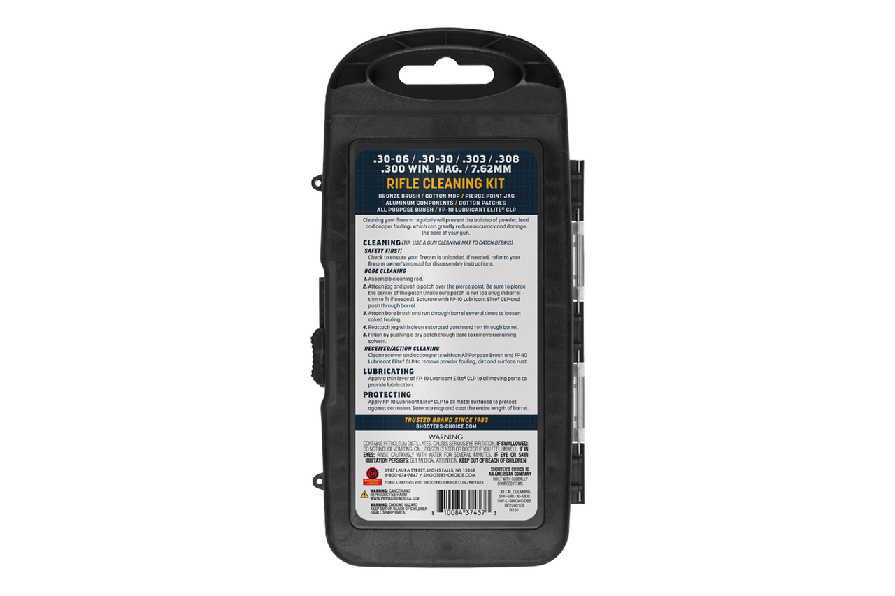 Dirty Bird’s .30 cal Rifle Cleaning Kit contains quality components that won’t damage your firearm while cleaning. Get everything you need to clean your .30 rifle including .30-06, .30-.30, .303, .308, .300 win mag, 7.62 and other variants, in one place with this gun cleaning kit. Includes aluminum rod set with swivel t-handle along with a brush, mop, jag, slotted tip, bore guide and patches. An all purpose brush and bottle of FP-10 Lubricant Elite® CLP is also included to keep your firearm properly lubricated and operating smoothly.