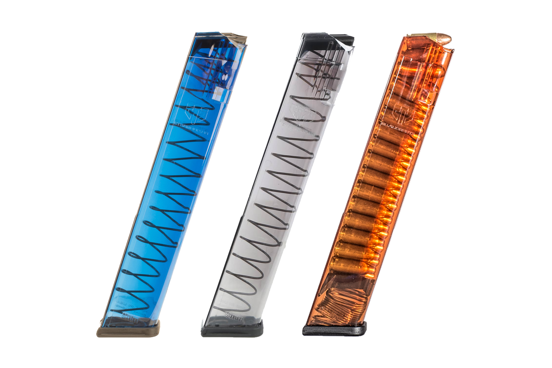 This ETS Group magazine for GLOCK 18 is a 32-round translucent polymer magazine compatible with every generation of 9mm double stack Glock handguns. The proprietary polymer construction is highly resistant to impacts, temperatures, UV, and harsh chemicals that may adversely affect many other polymer magazines. Unlike many other after-market magazines for the Glock, the ETS magazines are fully compatible with Glock and aftermarket floor plates. This is a 32-round, full-capacity 9x19mm magazine.