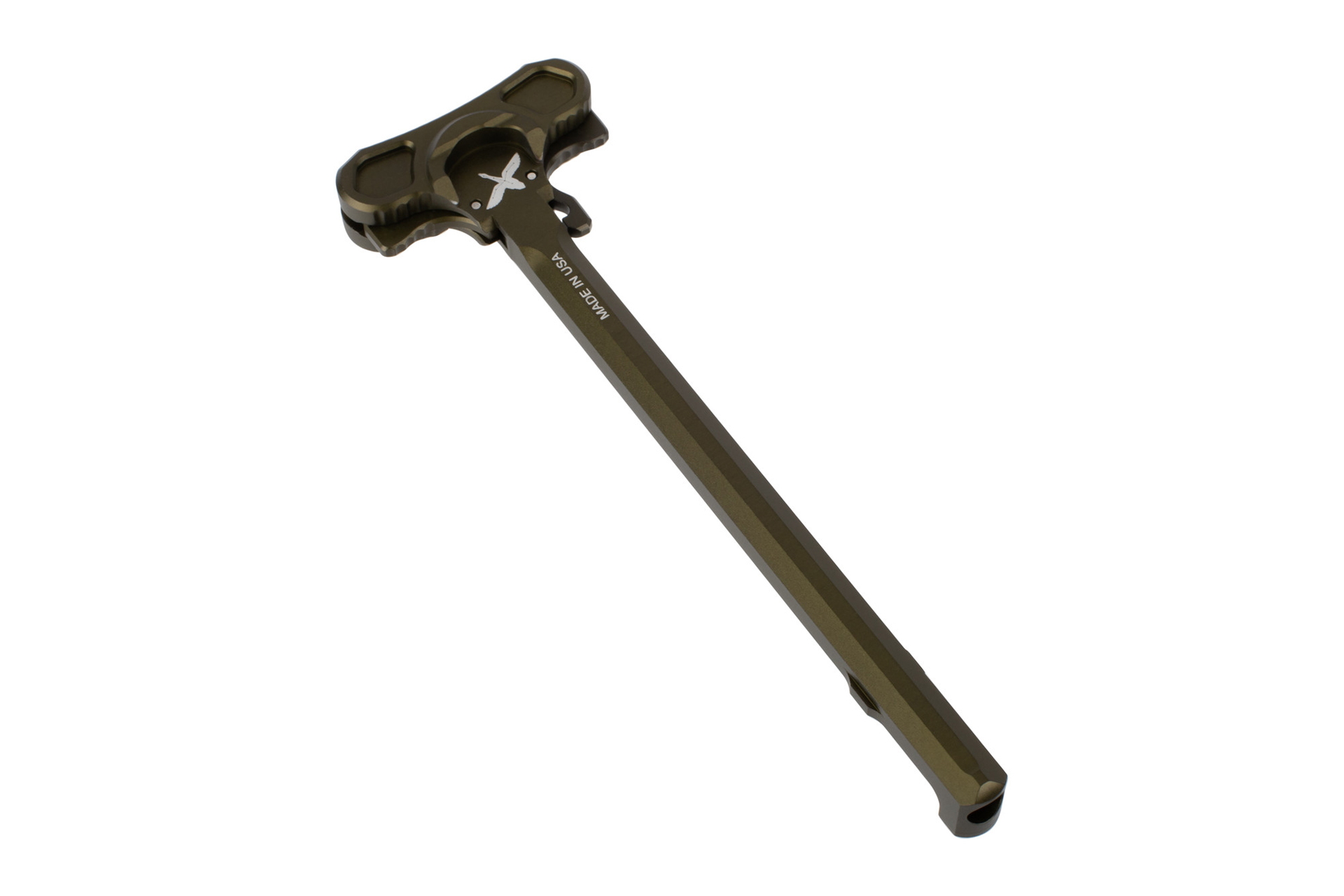 4. A “constant motion” latch on either side of the T handle. The name derives from that the latches don’t come to a hard stop prematurely, but will instead continue to move into the ACF’s T handle when mortared. When a user needs to mortar the weapon, no stress is placed on the latches. Though the solid pins we use are immensely strong, the latches and the ACF body are both aluminum. A design that allows the latch to hit a hard stop, or bottom out, invariably stresses the material around the pin holes. Imagine trying to slam a revolving door, it keeps rolling.