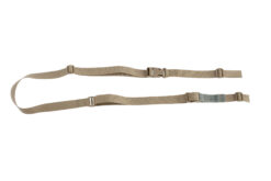 - A quick-detach buckle on the buttstock or rear end of the sling, oriented in a way that the buckle won’t pinch the user’s finger when he uses it to quickly and easily drop the sling. The quick-detach buckle is only on the rear side of the sling, not in front. When released (carbine in the typical slung position, with the buttstock near the user’s shoulder pocket), the rear-located quick-detach buckle allows the sling to drop free by gravity alone, out of the way of the user. In contrast, a front-located quick-detach requires the user to squirm out of the sling. It’s a small thing. We realized the benefit of a rear-attached QD buckle and used it all the time, and never the front-attached buckle, so a front-end QD buckle is omitted altogether.