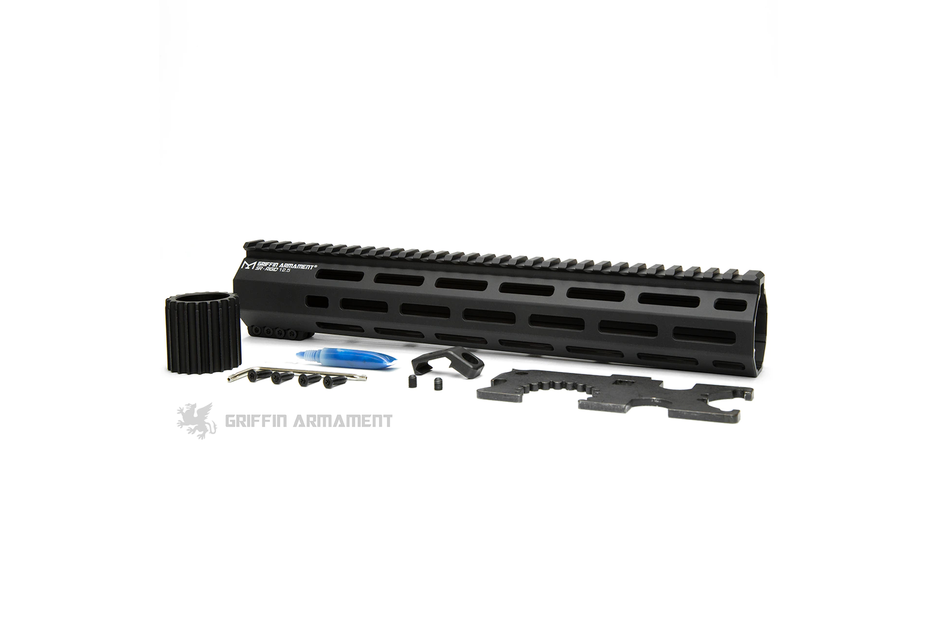 Griffin Armament® M-LOK compatible SR rails (Suppressor Ready) allow up to 1.5” outside diameter silencers to be mounted inside the octagonal M-LOK rail. This provides suppressor aficionados with a sleek, compact overall length for AR15-type firearms. The design objectives of this rail were to provide a suppressor-compatible rail with increased rigidity and durability compared to similar-weight, profiled current market options. A custom extrusion provides significant internal reinforcements to reduce flex when loading the carbine on the rail.