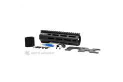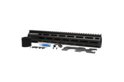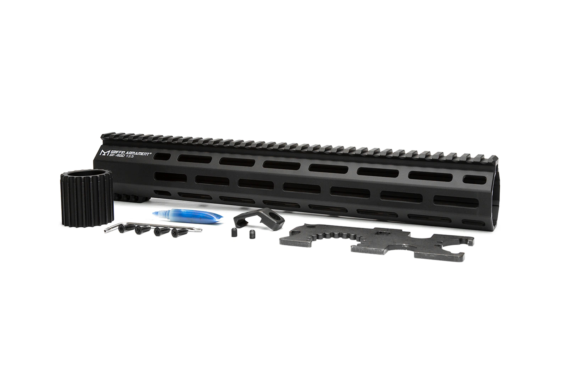 The new SR rails feature a close tolerance, heavy-duty, 7075 aluminum, T-6, type 3 hard coat anodized finish. The barrel nut can be easily installed to 35-85 ft/lbs using the included Griffin Armorers Wrench. The new slip-fit clamp design is extremely user-friendly and requires no shims or special timing methods. The clamp geometry in the rear section of the rail is low-profile and ergonomically pleasing, even for extended carry at static security positions. Flathead T15 Torx screws should be tightened to 25/in pounds. M-LOK flats on each 45-degree surface allow you to mount your favorite M-LOK accessories. A contiguous Picatinny top rail ensures repeatable, accurate mounting of night vision and thermal systems.