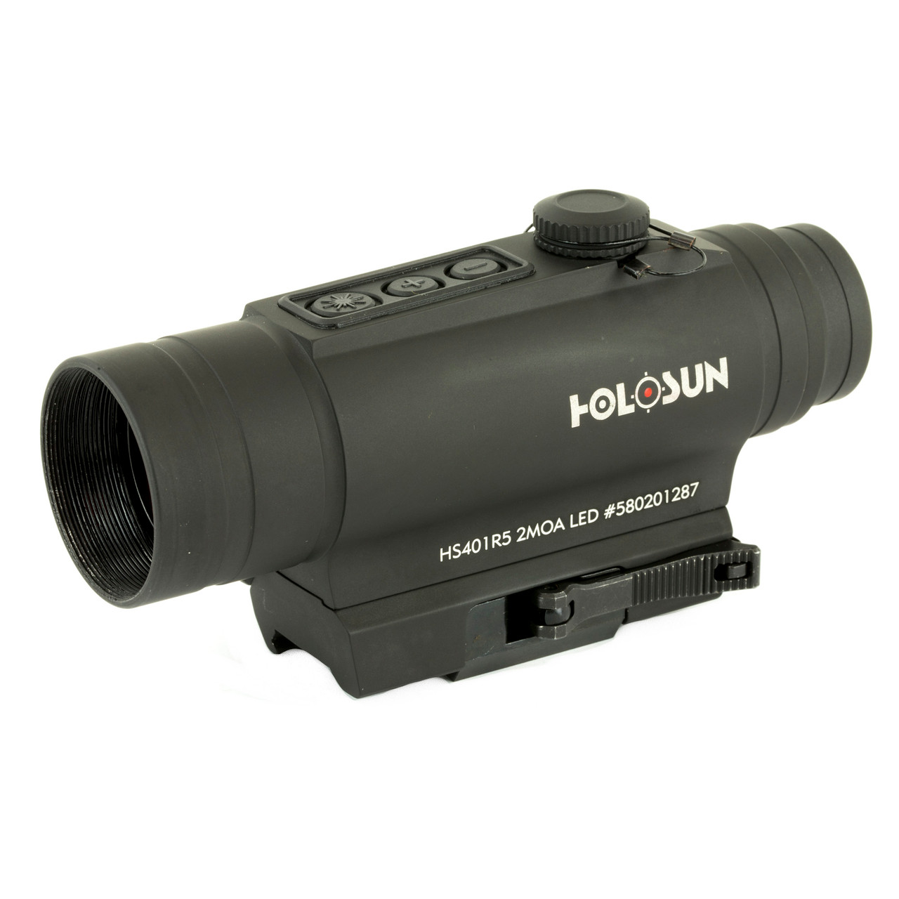 The HS401R5 is a 30 mm Tube Red Dot optic. Featuring a 2 MOA dot and an integrated red laser, this optic is rugged and versatile. The HS401R5 includes flip-up caps.