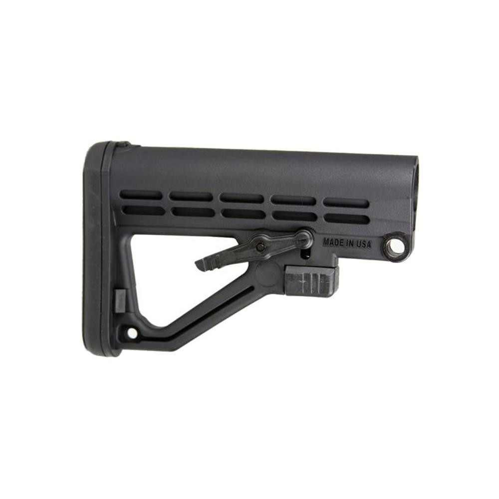 The Black Rifle Depot JE5 Mil Spec AR-15 Stock is manufactured in the United States of high-grade polymer. Its Features include a skeletonized lightweight design with a removable rubberized buttpad and an ambidextrous QD swivel mount.