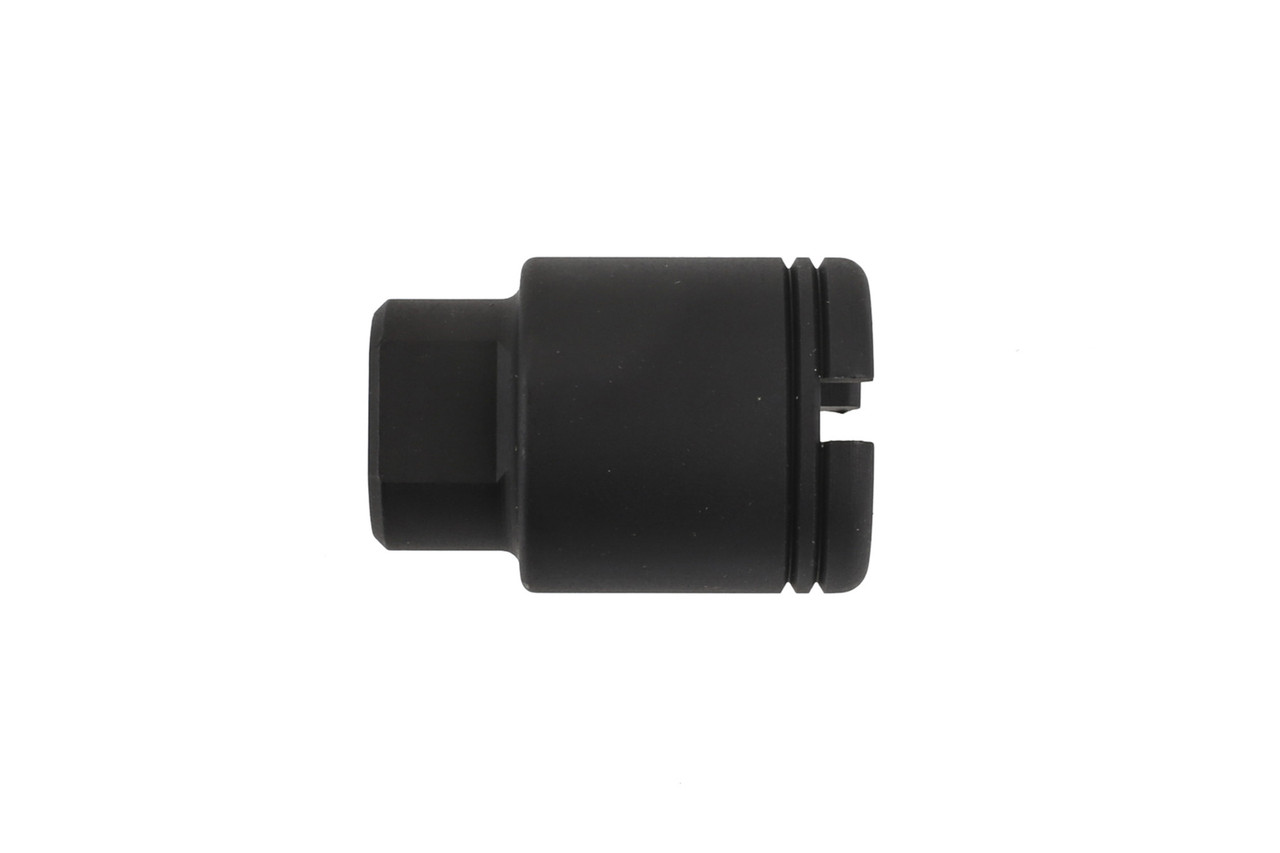 The KAK Industry 1/2-28 Slimline Micro Flash Can features a slim 1.2″ outside diameter allowing it to be recessed under the majority of modern slim M-LOK or KeyMod Handguards. This simple yet effective flash can directs gasses, noise and concussion down-range away from the shooter. This is especially useful when shooting a short barreled rifle or pistol build.