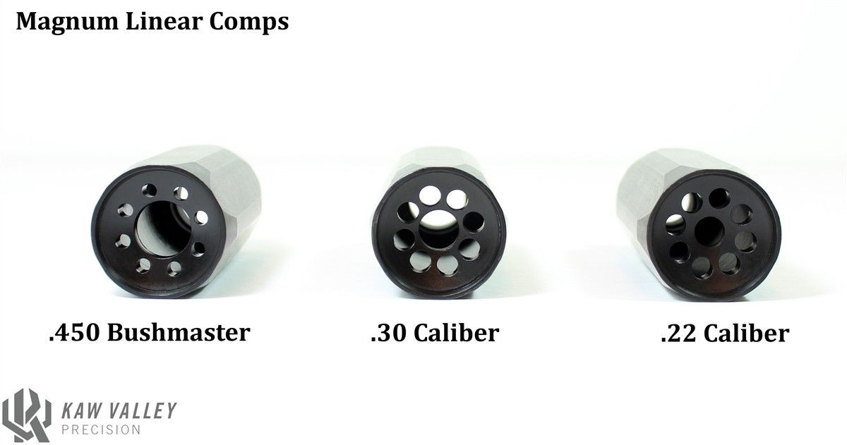 Kaw Valley Precision Linear Comps are part of a small family of compensators aimed at taming muzzle concussion. The KVP Magnum Linear Comp, collects and redirects muzzle gases away from the shooter. This redirection helps reduce the perceived decibels the shooter experiences at his or her ear. By pushing excessive noise and concussion downrange, not only will the shooter experience a much softer shooting experience, bystanders will also benefit from the redirection of the muzzle gasses. Kaw Valley Precision has been a part of many successful applications of our linear comps in many shooting disciplines including: CQC (close quarters combat), Competitive Shooting, Varmint Hunting, Law Enforcement, and Indoor Ranges to name a few.