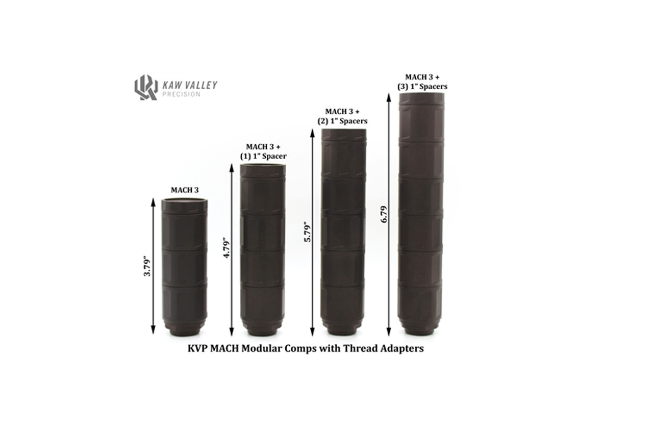 The KVP MACH Modular Linear Comp is a Patent Pending linear compensator system that is completely user configurable! If you’ve struggled to find a comp the correct length for the perfect “tuck,” configure your own! By utilizing 1-1/8″x28 TPI internal threads, the MACH Modular Linear Comp can utilize common suppressor attachments, such as a SilencerCo 3-Lug Mount, SilencerCo Direct thread mounts, etc. KVP has opened up a level of modularity that has never before been offered in the Linear Comp market. The Mach Comps allow end users to run any length comp they want, including extra long configurations acting as a placeholder for a suppressor awaiting a Form 4 approval. Each component is machined from 6061-T651 Aluminum and hard coat anodized for wear protection. The MACH system utilizes a 1-1/4″ hexagonal wrench flat configuration for easy installation with a standard open end or adjustable wrench.