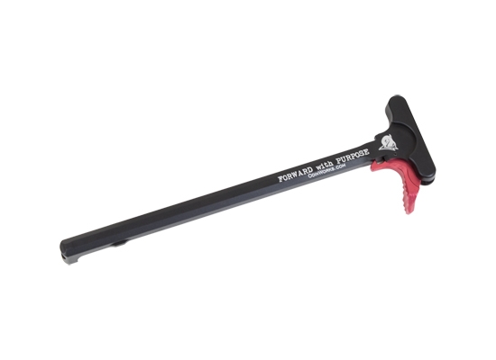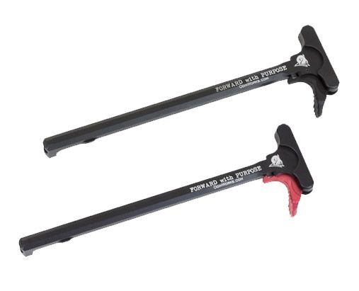 It’s made of high quality 7075 Aircraft Grade Billet Aluminum, and it has an ergonomic design that was made specifically for comfortable operation in various conditions. It can be used for any AR-10 or LR-308 type platforms, and you have the option of a Black or a Red colored XCH (Extended Charging Handle) Latch. The Black XCH latch would be a better color choice to match most any AR rifle or pistol, but the Red XCH latch would be better for a competition platform cause it’s easier to see in the heat of the action. The Red XCH latch is also a great addition to your firearm if you run a two-tone AR in red and black. The charging handle has the words “Forward With Purpose” on it, as well as the company name/web address.