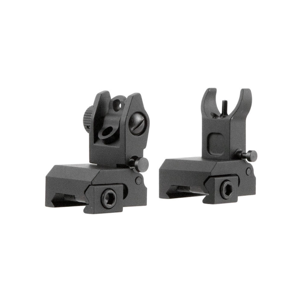 The Tacfire Same Plane Flip-Up Iron Sights are constructed of T6 6061 anodized aircraft grade aluminum for strength and durability. The front sight has an adjustable A2 post and ball pivot detent with posi-lock design that automatically locks into place to guarantee zero when raised. The rear sight is adjustable for windage and has two apertures, great for close and long distance shooting.
