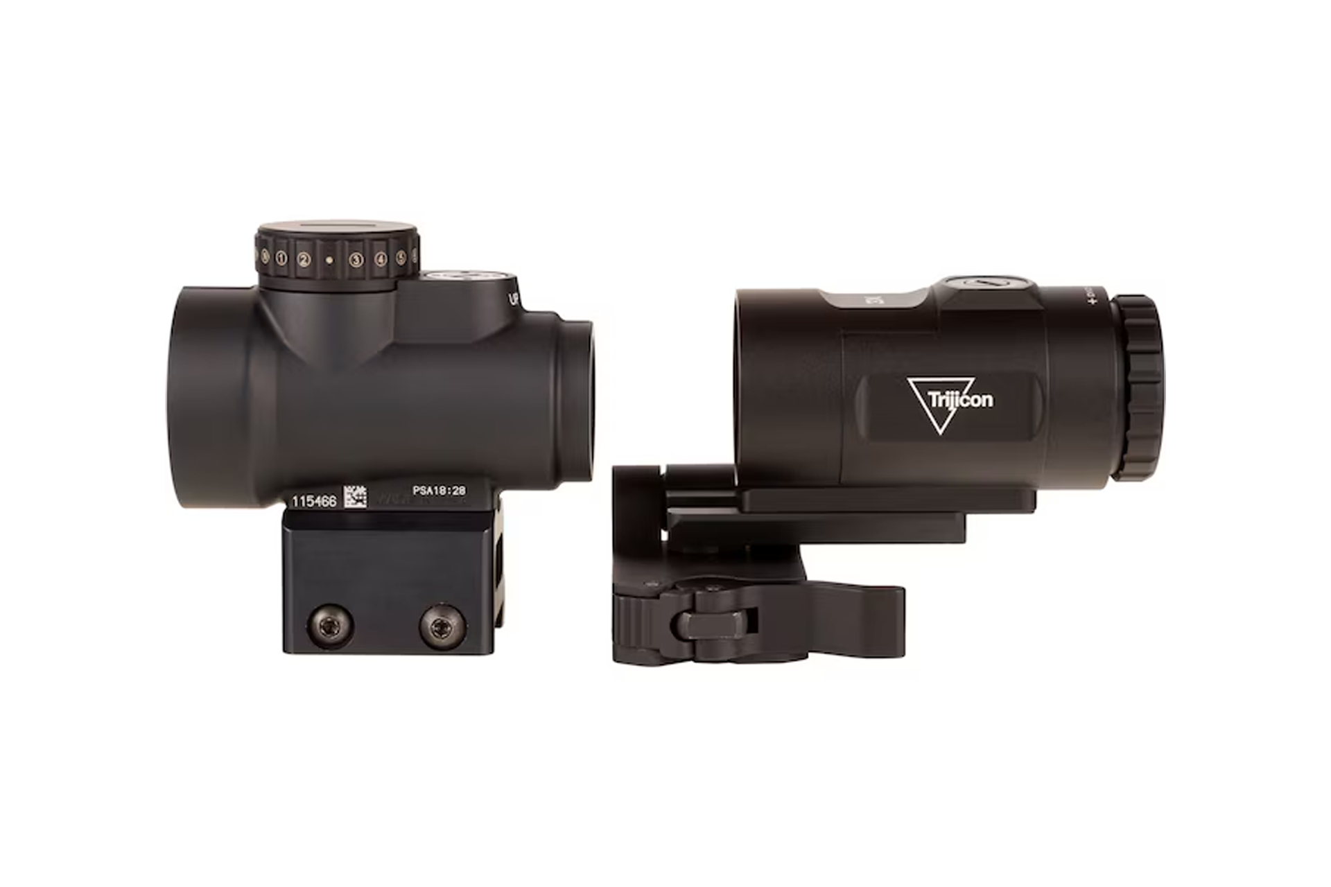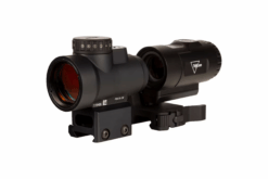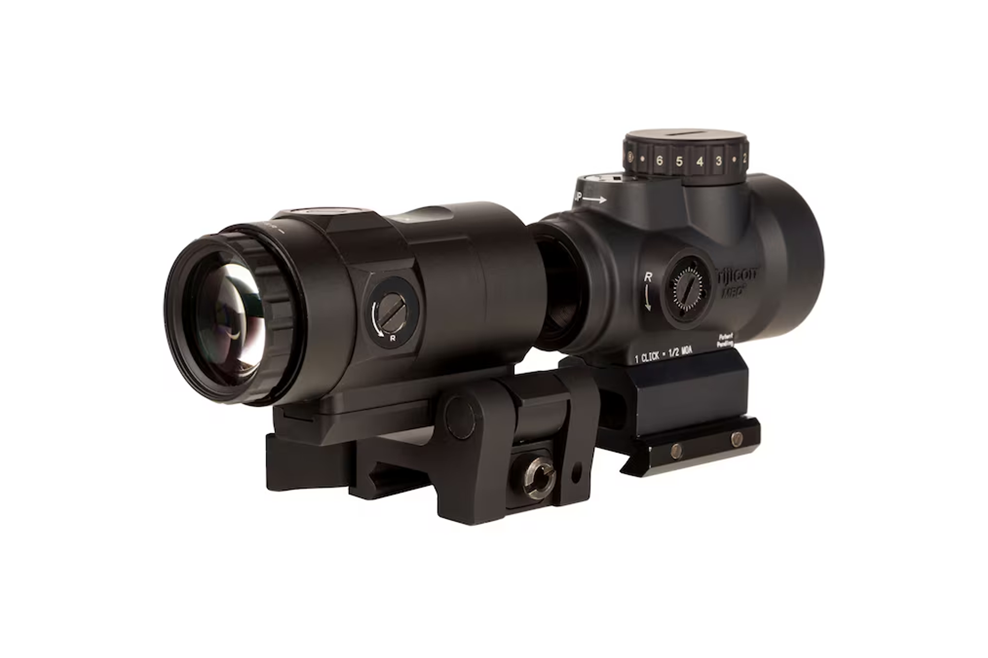 The Trijicon MRO Series features a large aperture maximizing the viewing area, allowing for better situational awareness and fast target engagement. It also features ambidextrous brightness controls, sub-flush adjusters, advanced lens coatings, and a fully sealed, waterproof, hard anodized forged 7075-T6 housing, making the MRO the ultimate mini reflex sight. The 3x magnifier includes a professional grade flip to the side, quick release mount.