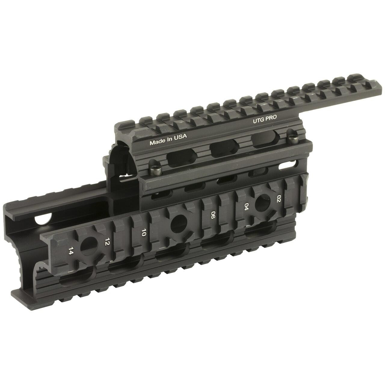 The UTG Pro universal AK-47 quad rail handguard fits Romanian” Bulgarian” Chinese and US AK’s and variants” including models with oversized barrel/rear sight block. There are four Mil-spec picatinny rails with integrated QD swivel housings on left/right rails for versatile accessory applications. Black rubber rail guards are included.