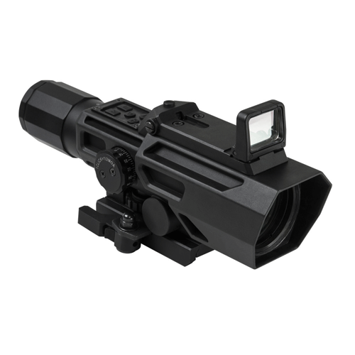 The NcStar ADO 3x-9x Scope w/ Red Dot Optic combines two incredible optics into a single versatile scope perfect for tactical, hunting, and competition applications. These Riflescopes by NcStar feature an integrated pop-up red dot sight that deploys and switches on automatically with a push of a button and automatically shuts off when folded down to the closed position, placed on top of a 3X-9X variable magnification scope with an illuminated reticle. Great for ambidextrous use, the NcStar Advance Dual Optic 3-9x42mm Rifle Scope w/ Red Dot Sight has a handy control panel on top of the scope that adjusts the brightness of the reticle and red dot and can change the reticle color from blue or red, and turrets placed on the bottom and side of the scope easily change the windage and elevation settings. With fully multi-coated lenses for a high-quality image and an auto-locking, quick-release mount for fast mounting to your favorite firearm, the NcStar ADO Variable Rifle Scope w/ Reflex Red Dot is sure to be your new favorite optic!