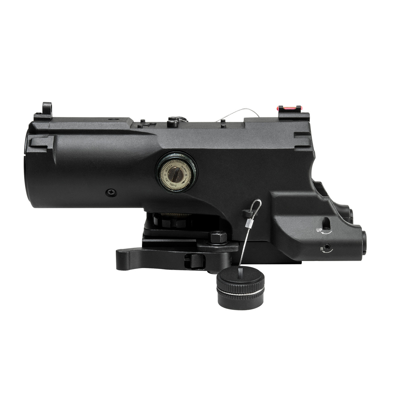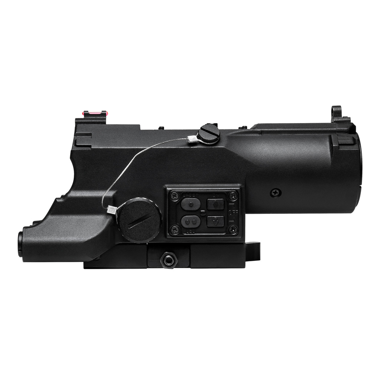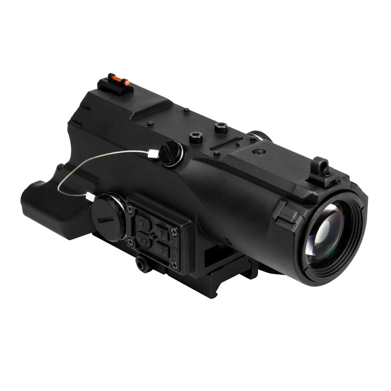 4X Magnification 34mm scope with two forward mounted Green Laser pod and Red/White LED Navigation light pod. Top mounted Backup Iron rear peep sight and Fiber Optic front sight post. There is three different mounting positions for the Iron Sights left and right offset and top 12 o’clock position. Top of the ECO scope has an integrated VISM Micro Dot reflex dot sight base for mounting a secondary reflex optic to the top of the scope. Black Anodized Die Cast Aluminum body.