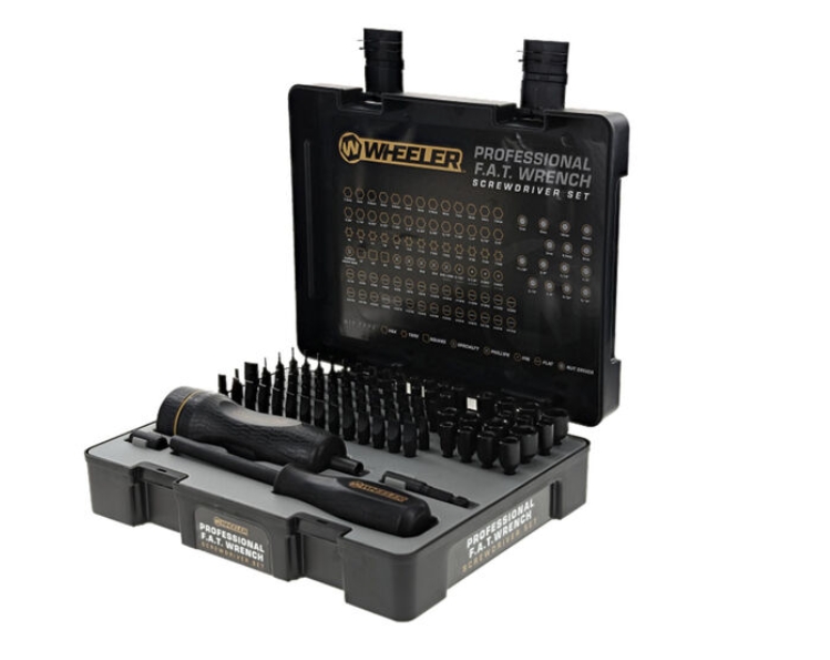 The Wheeler 100‑Piece Professional F.A.T. Wrench Screwdriver Set is a complete gunsmithing and precision‑torque screwdriver system. It includes the well‑known F.A.T. Wrench (Firearm Accurizing Torque) capable of delivering 10–65 in‑lbs of adjustable torque, along with 97 bits covering the full range of firearm fasteners.