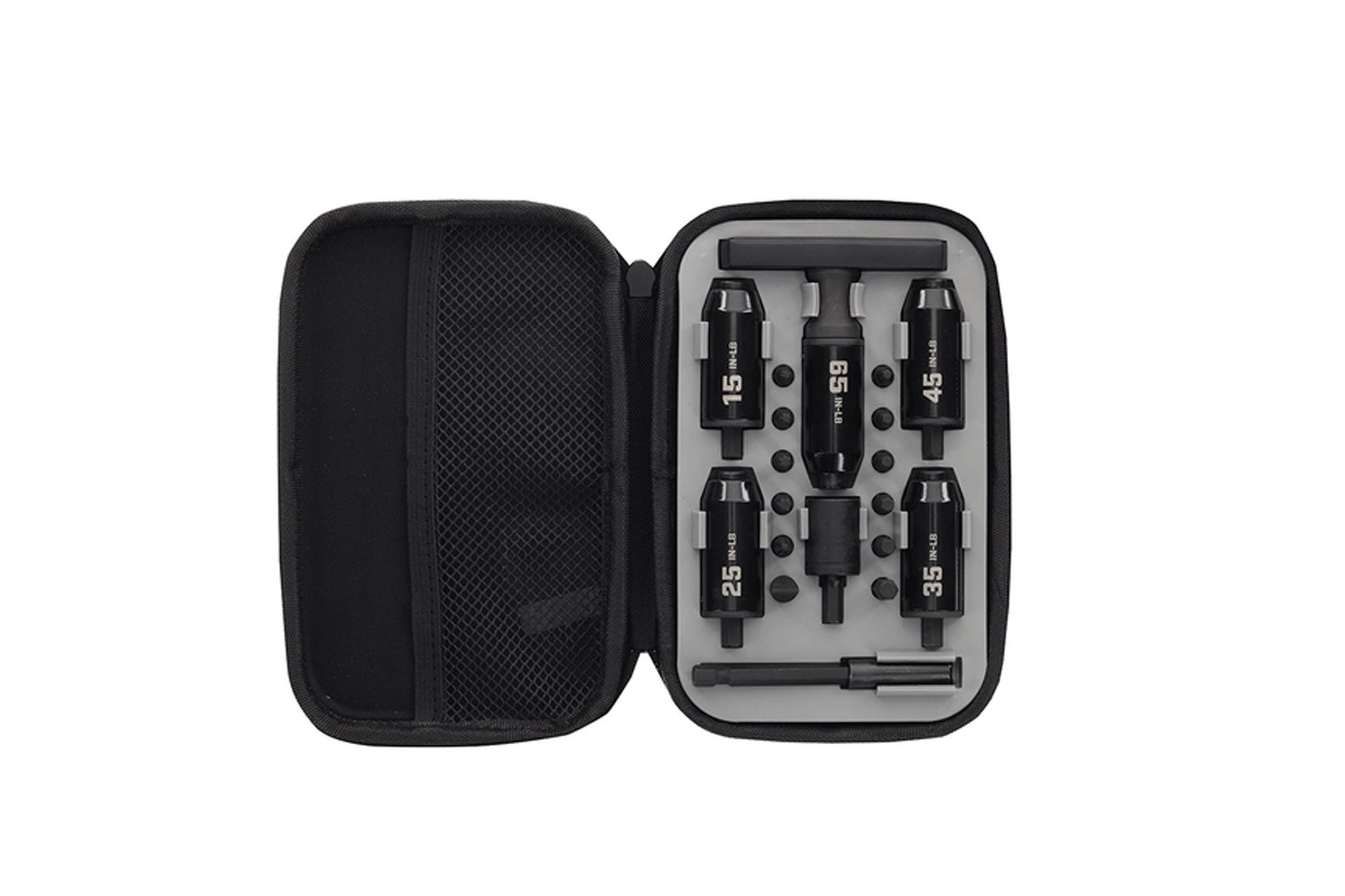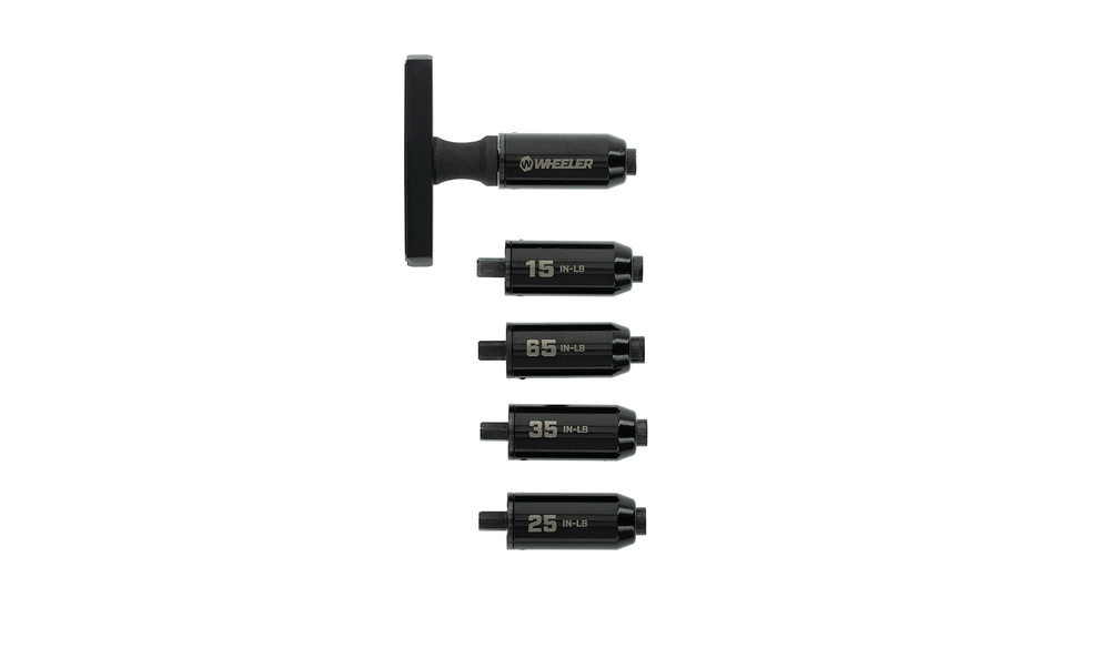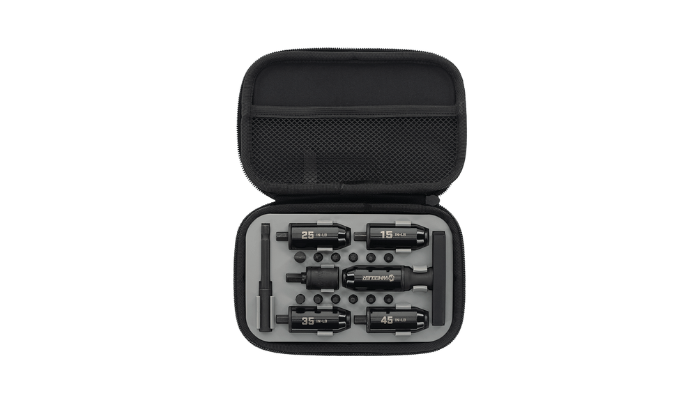 Built for precise tightening at the bench or on the range, this preset torque wrench set gives you a simple way to apply consistent inch-pound torque across common firearm and accessory tasks. It includes five torque limiters, 12 popular bit sizes, a 1/2-inch socket, and a 1/4-inch drive bit extension, all packed in a convenient soft carry case. The ergonomic T-handle design adds comfort and control for repeated use.