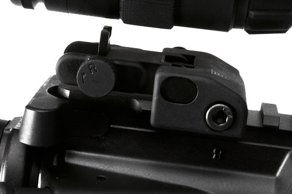- Flip the CSAT face down to reveal a standard, A2-style .200″ diameter peep for close-range only operations.