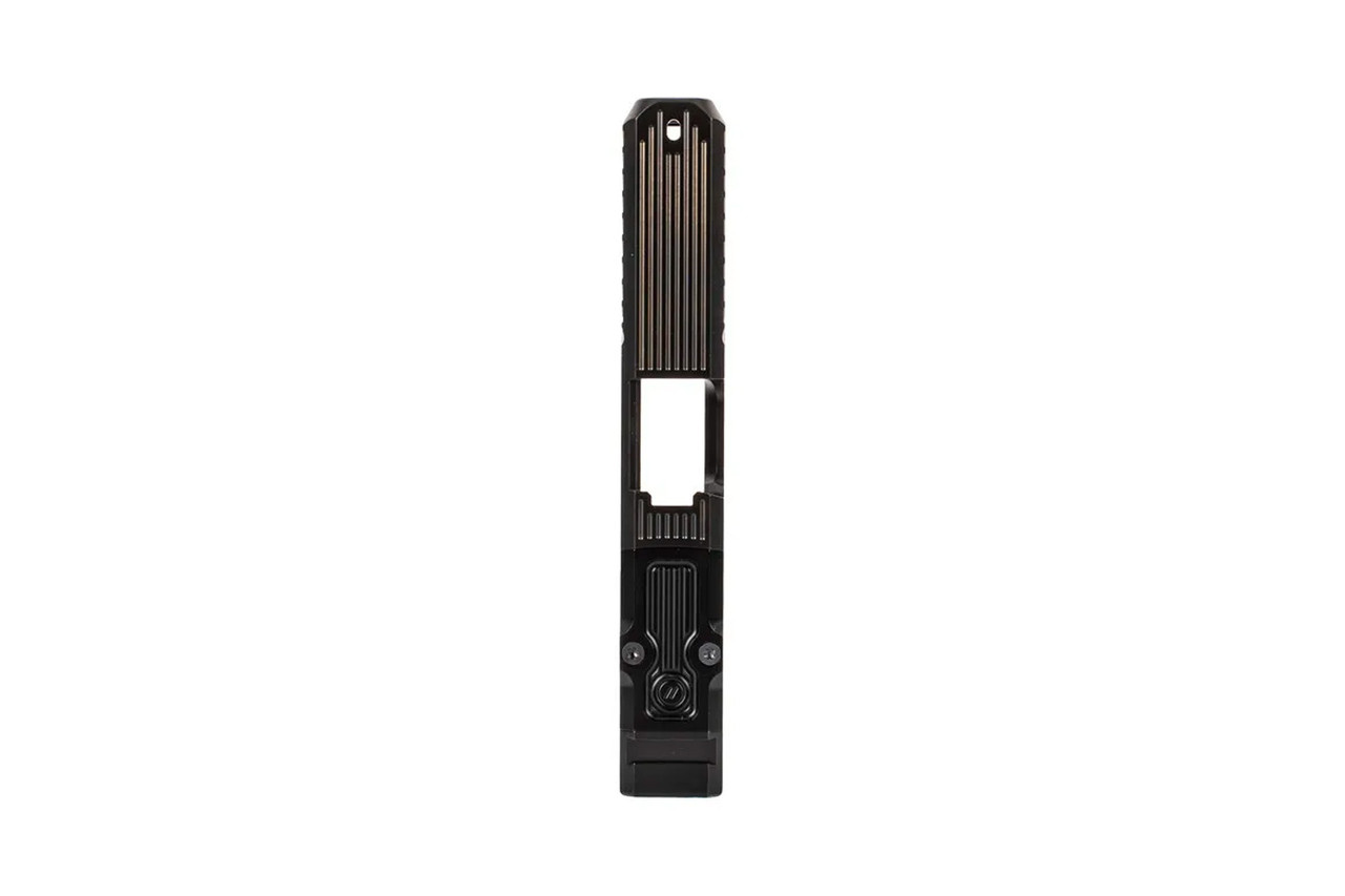 The Zev Technologies Z19 Citadel Stripped Slide is machined from 17-4 stainless steel on state-of-the-art CNC machines to provide a tighter slide to frame fit for increased consistency in barrel lockup. This Slide features aggressive slide serrations that improve grip as well as reduce weight. The matte black DLC finish and top slide channels help to reduce glare. Additionally, the ejection port has been lowered to improve ejection of brass and increase reliability. The slide plate included with the Z19 allows you to securely mount an RMR red dot sight. Improve your Gen 5 G19 handgun with the Zev Tech Citadel slide.